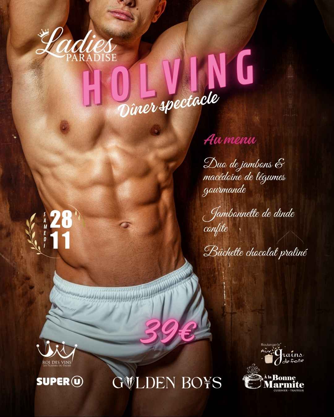 Vivez une soirée festive et décomplexée lors de la Ladies Paradise, un dîner-spectacle dédié à toutes celles — et ceux — qui aiment les hommes. Le samedi 28 novembre 2026, de 18h30 à 1h, retrouvez-nous à la salle polyvalente de Holving (57510) pour une expérience conviviale, gourmande et mémorable.